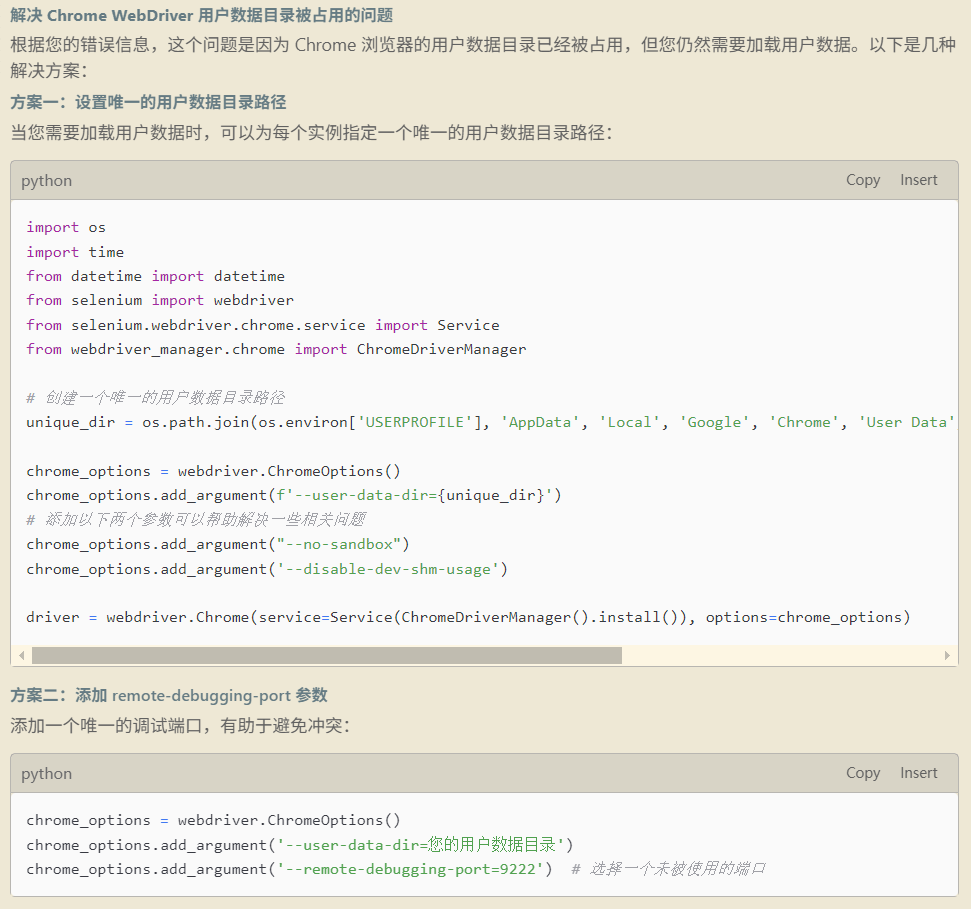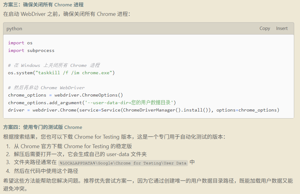 1  | driver = webdriver.Chrome(service=Service(ChromeDriverManager().install()), options=chrome_options),出现这样子的 错误:Message: session not created: probably user data directory is already in use, please specify a unique value for --user-data-dir argument, or don't use --user-data-dir 。但是我还需要加载用户数据。应该怎么进行修改 @web  |