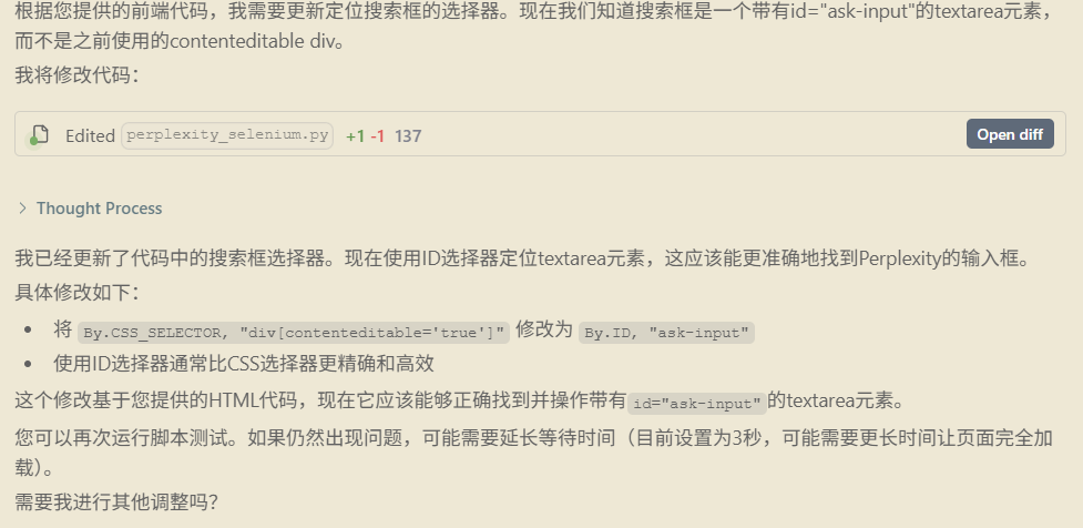 1  | @perplexity_selenium.py#L108 目前输入框的前端代码是:<textarea placeholder="Ask anything…" class="overflow-auto max-h-[45vh] lg:max-h-[40vh] sm:max-h-[25vh] outline-none w-full font-sans caret-superDuper resize-none selection:bg-super/50 selection:text-textMain dark:selection:bg-superDuper/10 dark:selection:text-superDark dark:bg-offsetDark dark:text-textMainDark dark:placeholder-textOffDark placeholder:select-none bg-background text-textMain placeholder-textOff scrollbar-thumb-idle dark:scrollbar-thumb-idleDark scrollbar-thin scrollbar-track-transparent" autocomplete="off" rows="2" id="ask-input" data-1p-ignore="true" style="height: 48px !important;"></textarea>。请根据此选择合适的。  |